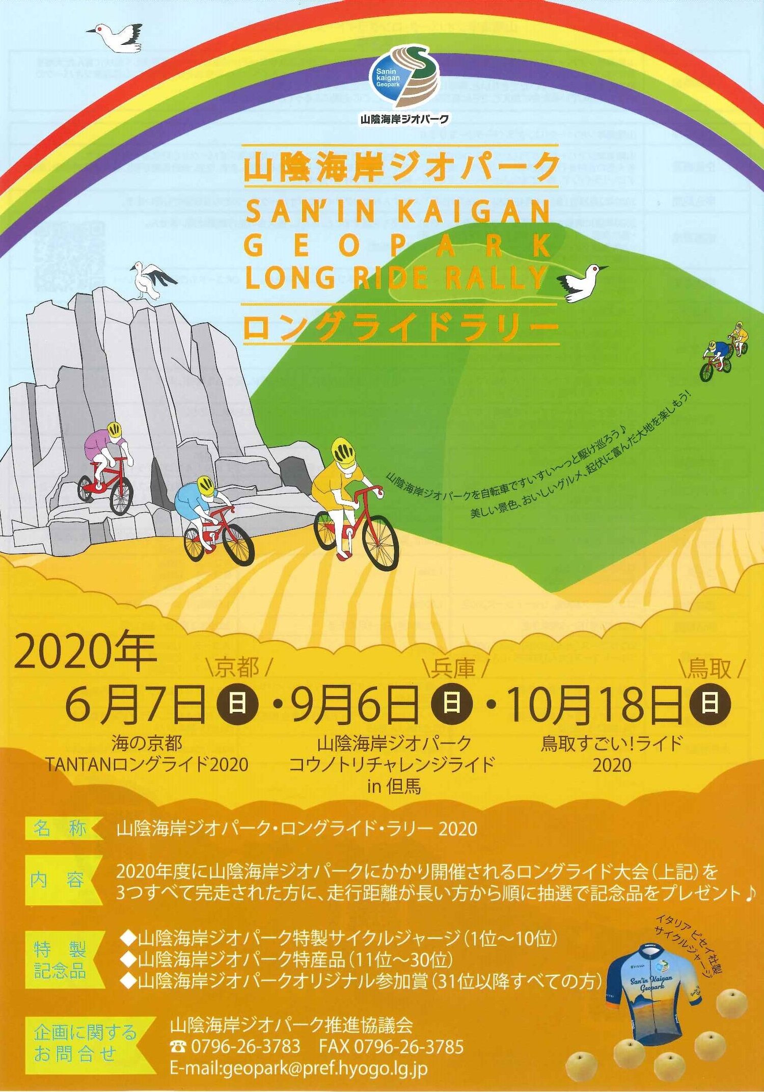 山陰海岸ジオパークは京都府京丹後市から鳥取県鳥取市まで東西120kmに渡る広大なエリアに位置します。自然が美しく起伏に富んだ大地を直に味わっていただくには自転車が最適です。このエリアにかかる3つのロングライドイベントへの参加をきっかけに、山陰海岸ジオパークの魅力を存分に味わっていただきたいと、昨年に引き続き2回目の企画をいたしました。