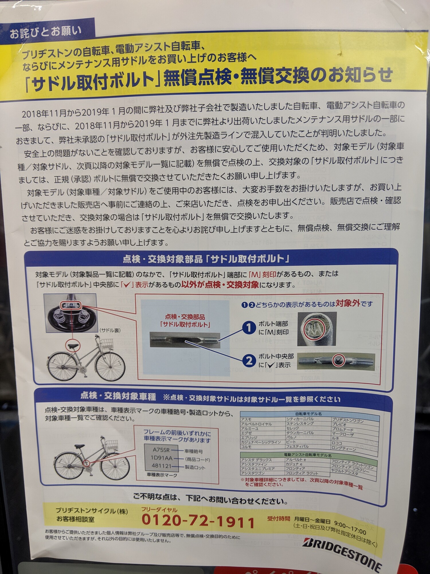 2018年11月から2019年1月までにブリヂストン/ブリヂストン子会社にて製造された自転車・電動アシスト自転車・メンテナンス用サドルの一部に使用されているサドル取り付けボルトに、ブリヂストン社未承認のものが混入していることが判明しました。